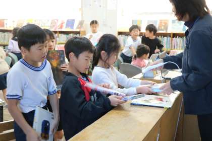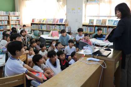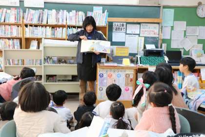 2年生国語・図書の様子です。図書に時間の初めには1冊本の読み聞かせがあります。今日は「じごくのそうべい」。ほかにもシリーズで何冊かある人気のお話です。本を読んでいただいた後に、自分の好きな本を読んだり借りたりします。