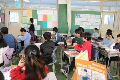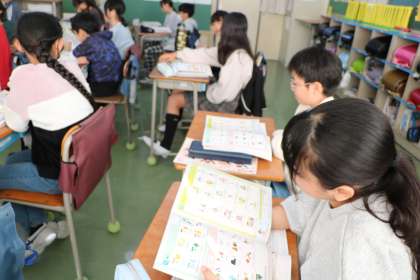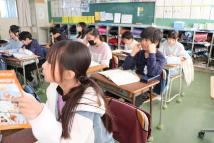 5年生外国語の様子です。教科書のイラストを見ながら、何かをするときの言い方を先生に続いて繰り返し発音します。