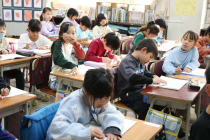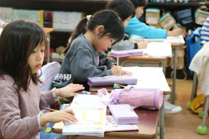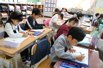 1年生の様子です。カタカナで書く言葉をノートに書いています。私もヒントを出してたくさん協力してしまいました!