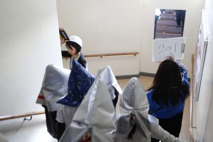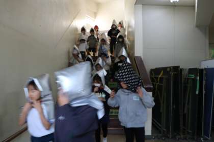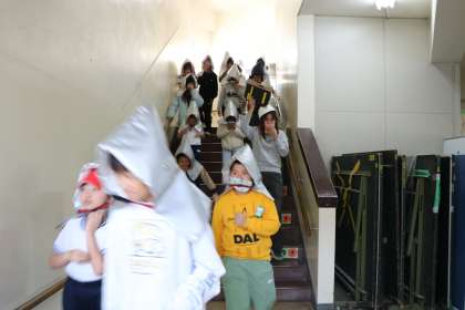 廊下はおしゃべり声が全く聞こえてきません。先頭の先生が掲げるクラス表示を見ながら静かに行動できます。