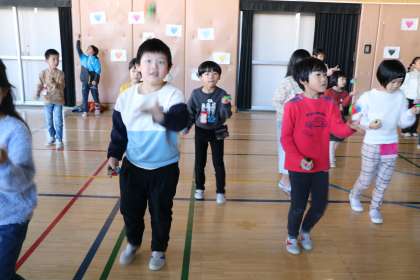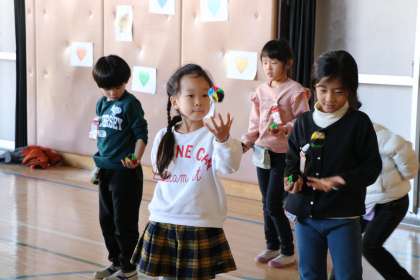 1年生はお手玉で楽しく遊んでいるうちに、とっても上手になりました。お手玉ダンスも曲に合わせてかわいい動きです。
