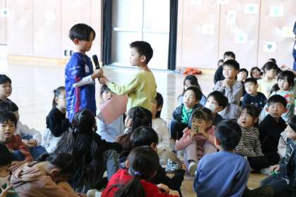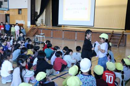振り返りの時間は、自分の感想や頑張ったことを言いたい子がたくさんいました。幼稚園のお友達もしっかりこたえていました。