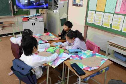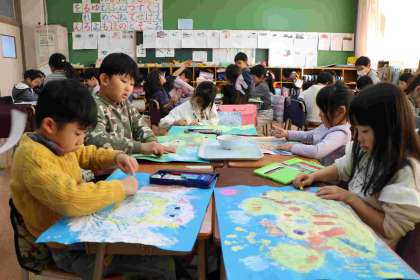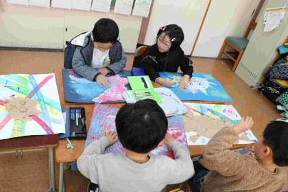 くしゃくしゃ紙、絵の具、チョークなどを組み合わせて使って、すてきな作品を作りました。