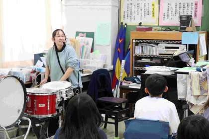 次に「どんな楽器を使っていそう?」という先生の問いかけに「たいこ」「ふえ」など聞こえた音色に合う楽器を考えました。