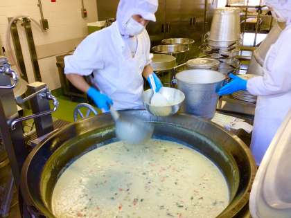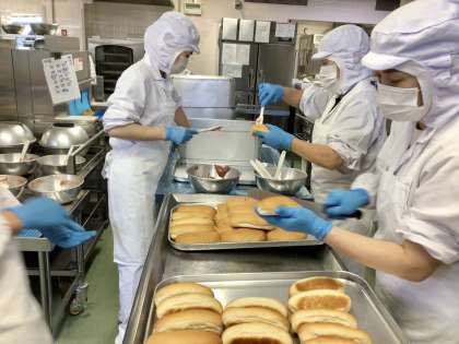 今日のシチューには、冬が旬のたらが入っています。一度オーブンで香ばしく焼いてからシチューに加えています。たらは高たんぱく、低脂肪のヘルシーな白身の魚で、味にくせがなくいろいろな料理に合わせられます。シチューにはほかにもたくさんの野菜が入った具だくさんのシチューです。いちごジャムサンドは、給食室でひとつずつパンにいちごジャムをはさんで作りました。