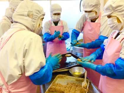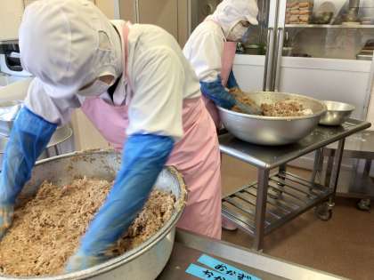 「さんが焼き」は千葉県の郷土料理です。漁師さんたちが房総半島近くの海でよくとれるあじやいわしをみそと一緒にたたいて作るなめろうという料理を、あわびのからに入れて焼いた料理をさんが焼きといいます。給食では、いわしとあじのすり身のほかに鶏ひき肉やたっぷりの野菜もまぜてこどもたちの口に合うようにアレンジして作っています。栄養バランスのよい郷土料理です。