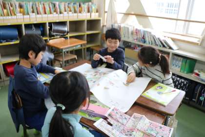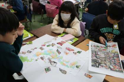 3年生社会科の学習です。日本地図を広げて野菜の産地調べを班で協力しながら進めています。