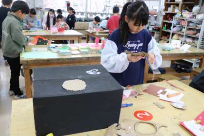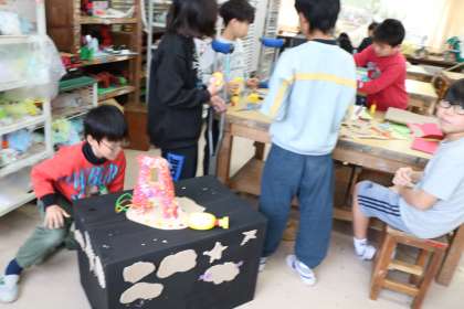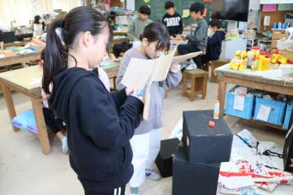 4年生図工の様子です。飛び出す仕組みを生かしてクリスマスカードを作ったり、展覧会で作品を飾る台を作ったりしています。