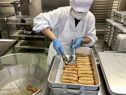 今日は給食室で約600本の春巻きを手作りしました。具は、にんにく、しょうが、豚肉、たけのこ、にんじん、きゃべつ、干ししいたけ、春雨です。具を調理してから、一本一本包むので巻くだけでも1時間半以上かかりますが、こどもたちはおいしいおいしいと喜んで食べてくれてよかったです。