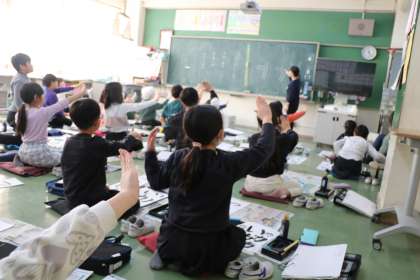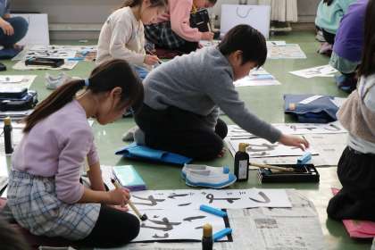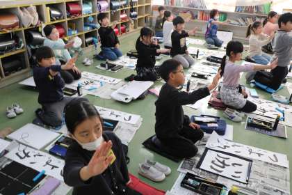 こちらは3年生の様子です。「力」の、「折れ」部分の筆使いをみんなで確認したり、注意しなければならないポイントを確認しながら練習します。