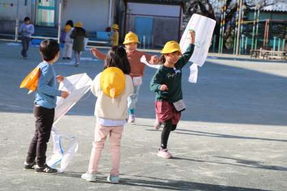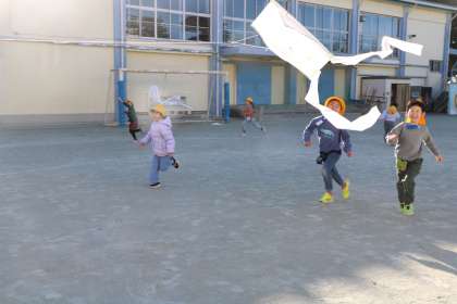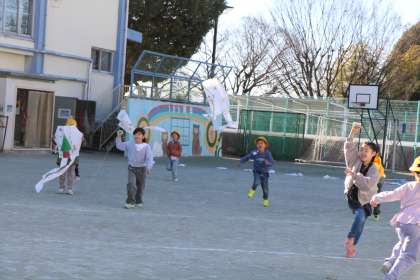 1年生生活科の様子です。手作りの凧あげ遊びを楽しんでいます。