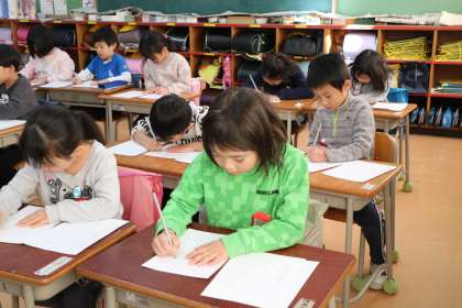 1年生の教室に入ると、全員で書初めについて今まで練習の時に頑張ってきたこと、気を付けるポイントを出し合っています。2学期末から一生懸命取り組んできたことがとってもわかります。「足ぺったん。背中はピーン・・・・」と、姿勢もばっちりです!