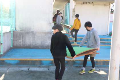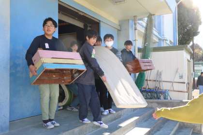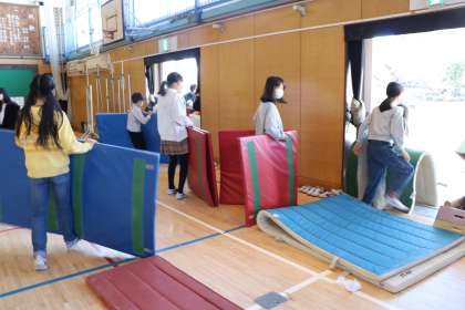 展覧会で使う用具としまう用具を手際よく運びます。体育館出入り口まで運ぶチームと、それを倉庫まで運ぶチームに分かれとっても上手に協力しています。