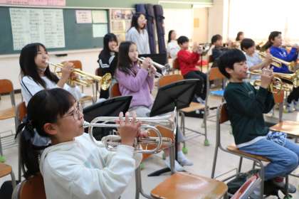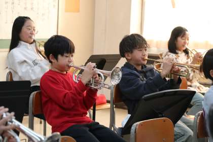 音楽室では先生による指導です。音楽室の楽器は日によって交代しながら先生に指導してもらいます。先生の声かけで、ぐんぐん上達するのがわかります。