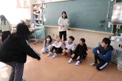 写真はジェスチャゲームをしている様子です。黒板に書いてあるお題を、ジェスチャーで表現し当ててもらうのです。「アイドル」や「犬」など、普段口で言うのは簡単でもジェスチャーだけで表現するのはなかなか大変です。