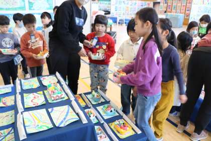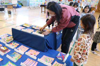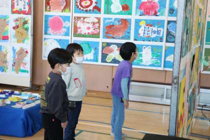 立体作品を置いたら、自分の平面作品を確認します。ほかの学年の作品も見たいけれど、今は我慢。金曜日のお楽しみです。