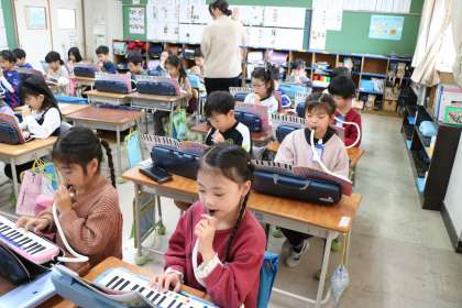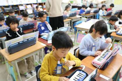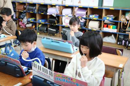 写真は1年生・音楽の様子です。鍵盤ハーモニカで2重奏を聞かせてくれました。アルト伴奏とメロディー部分が合わさるととってもすてきな演奏になりました!!すごい!!こんなに上手に演奏できるようになったとは!