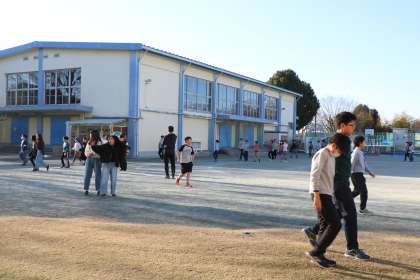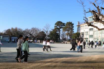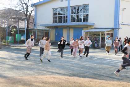 5・6年生は一番外側を走りますが、持久走を控えて早くも持久走のコースを走る子もいます。3分間の音楽が終わったら、急に逆方向に走って靴箱に帰るのは危険です。そのまま走らずゆっくり歩いて息を整えながら昇降口まで向かいます。