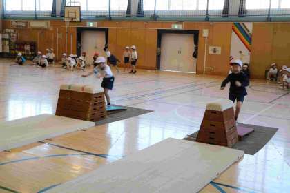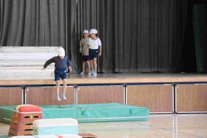 2年生の体育の様子です。跳び乗る、跳び越す、跳び降りる、それぞれの動きに挑戦していました。