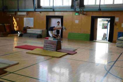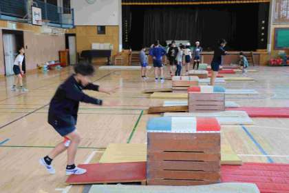 まずはマットの上で前転ができるか、跳び箱1段だったら、など、様々な練習の場を用意してステップアップを目指しました。