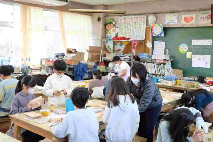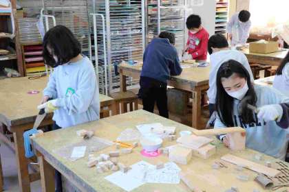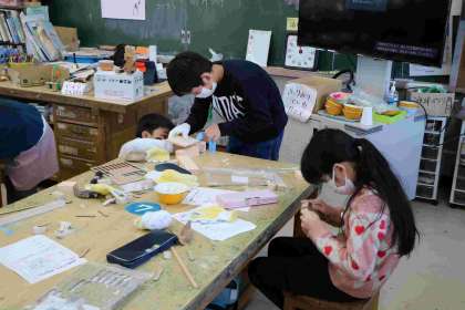 のこぎりで切る、とんかちでくぎ打ち、やすりでけずる、今まで学習してできるようになったことを応用して木工作をしています。
