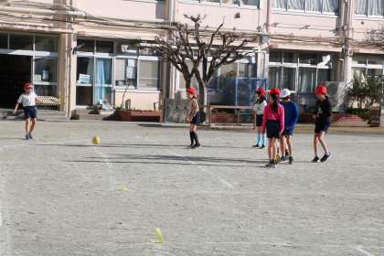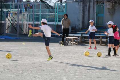 3年生体育・ラインサッカーの様子です。グループごとに練習をしたり、作戦を立てたりしています。松の間から富士山が大きく見える校庭です。