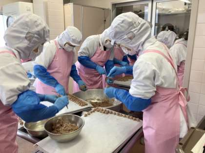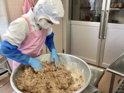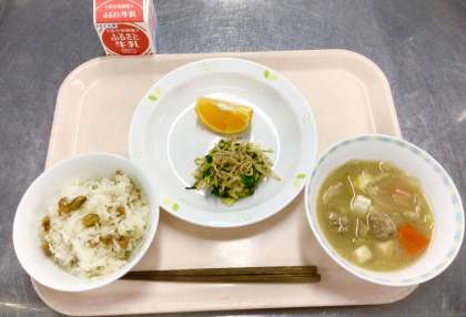節分豆ごはんは、揚げた大豆に甘辛いたれと青のりで味をつけてからごはんに混ぜています。つみれ汁はいわしのすり身としょうが、ねぎ、みそ、かたくりこを合わせてつみれを手作りしました。今日は立春で暦の上では春になりますが、まだまだ寒い日が続きます。バランスのよい食事をして、かぜなどにかからないじょうぶな体を作りましょう。