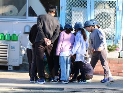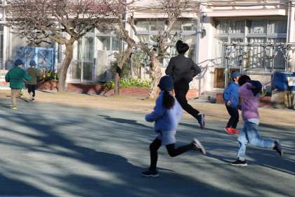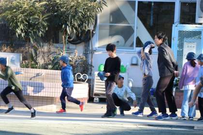 ・・・鬼決めジャンケンならぬ、参加する子の足で「誰になるかな」のような鬼決めをしていたのです。先生も一緒に鬼ごっこのスタートです。