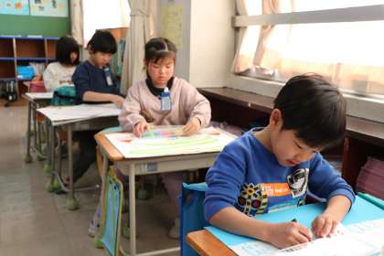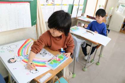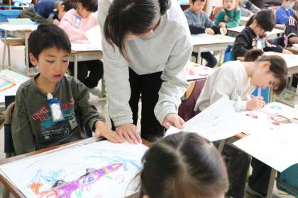 1年生図工「できたらいいなこんなこと」の様子です。図案を考えて下書きもしてきましたが今日はいよいよ絵の完成です。先生にアドバイスを求めたり、友達と相談したり、自分の作品に真剣に取り組んでいます。