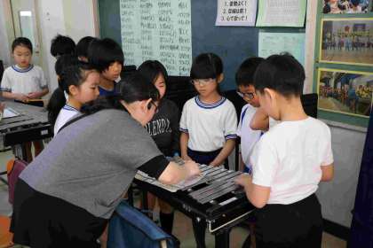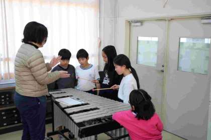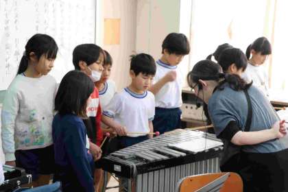 鉄琴に挑戦中です。先生や周りの友達がドレミを言ったり、リズムを手打ちしてくれたりして、上手にできるように協力し合っていました。