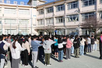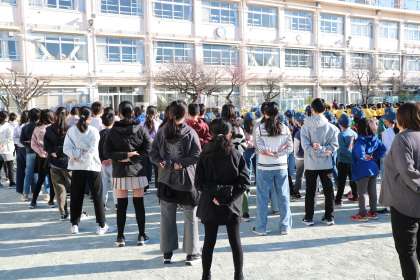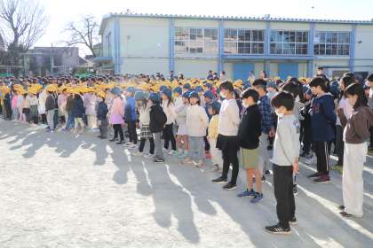 全校朝会の様子です。「おしゃべりをやめましょう」とか「静かにしましょう」などという声がかからなくても、静かに整列できるところが本当に立派な砧っ子です。