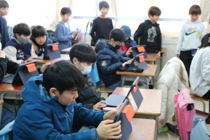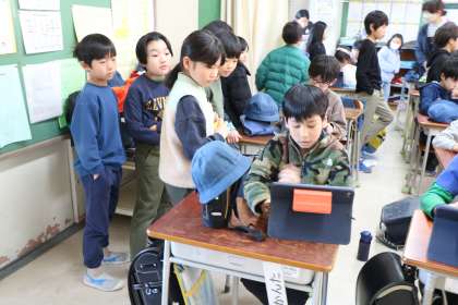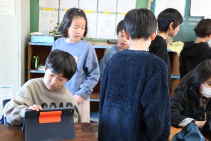 デジタルクラブの様子です。お兄さんお姉さんがiPadでどのようなことをしているのか画面を見せてもらいました。質問すると、詳しく説明してくれるお兄さんもいます。