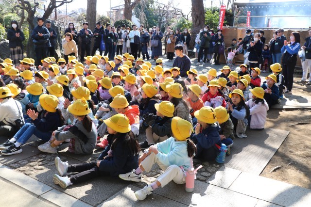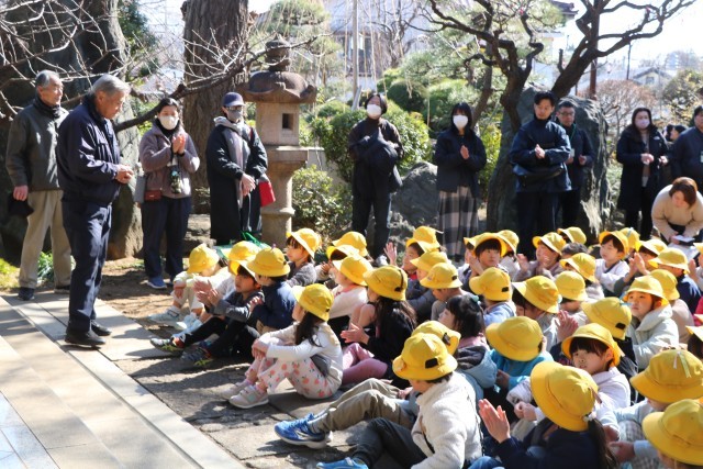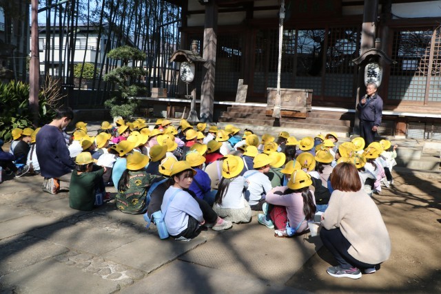 妙法寺に到着し、二の午祭のお話を聞きました。後ほど、赤いエプロンをした「おきつねさま」も見ましょうね。