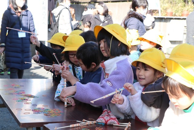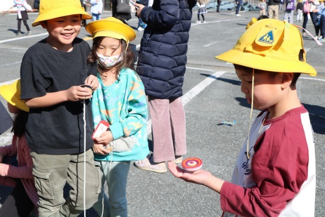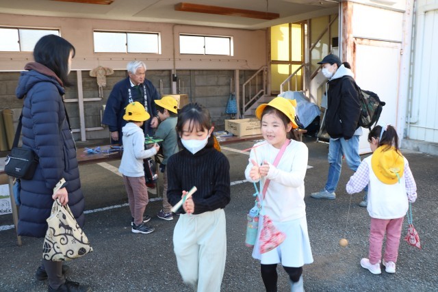 コマ回し、割りばしでっぽう、竹トンボの様子です。手の上でコマを回している子もいます!