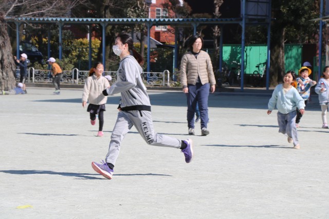 先生もゾンビになって、ゾンビ鬼ごっこを楽しむ1年生です。