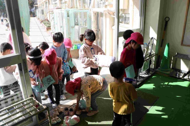 昇降口で靴を履き替える時は、脱いだ靴を1年生が袋に入れてあげるやさしさも見られました。