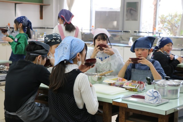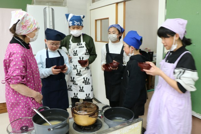 5年生家庭科、ご飯とみそ汁の調理実習の様子です。まず、出汁の味を確かめます。だしなしの味噌汁と出汁ありの味噌汁、どちらがどちらかわかるでしょうか。