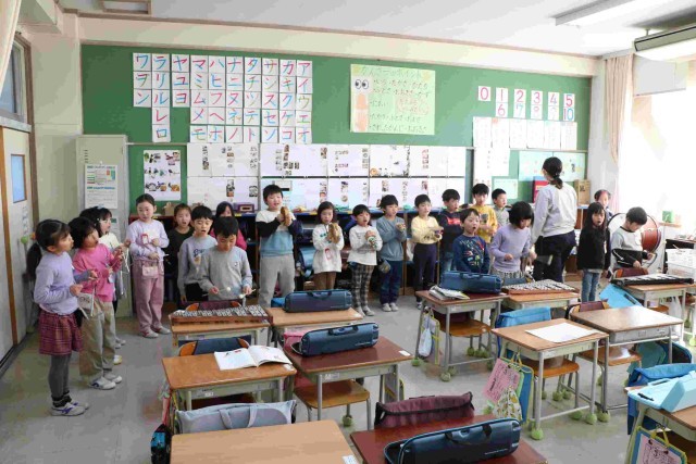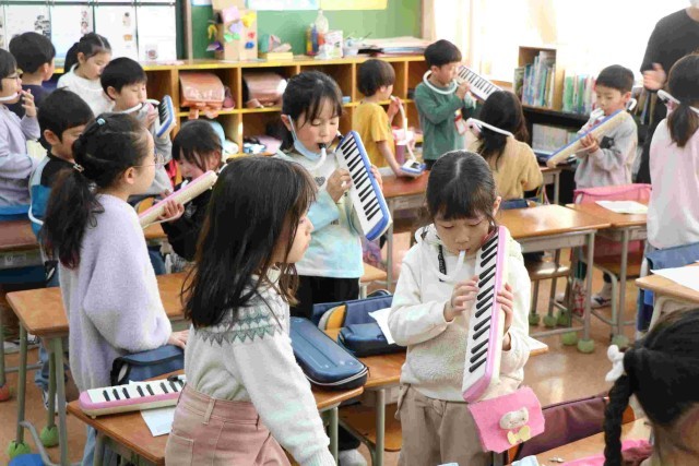 鍵盤ハーモニカのメロディーパート、伴奏パート、打楽器等の特別楽器パートに分かれて練習中です。学年全体で合わせて合奏するのが楽しみです。
