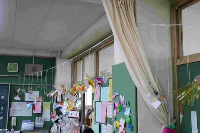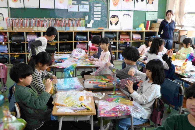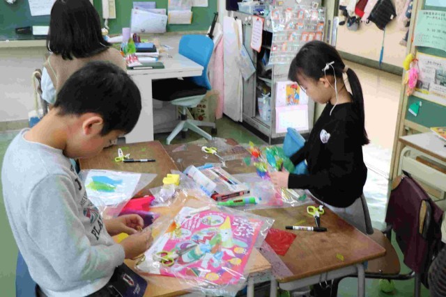 カラフルな透明の材料を使ってすてきな作品が完成しました。出来上がったのが嬉しくて「~の形にするために~したんだよ」「ここの色がきれいなの」と次々に教えに来てくれました。すぐに教室に飾ってもらえて、きれいな教室になっています。