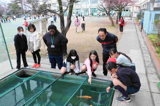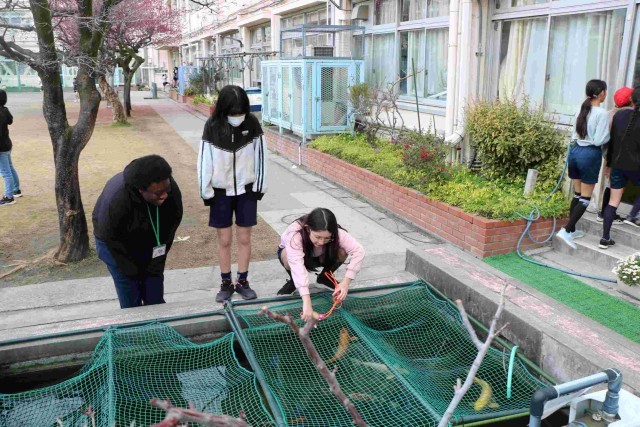 池の鯉に名前が付きました。4年生がALTと考えてくれたようです。写真と名前が掲示され、5年生も見ながら、「あれがケビン」「あれがスチュアート」と探しながらかわいがっていました。
