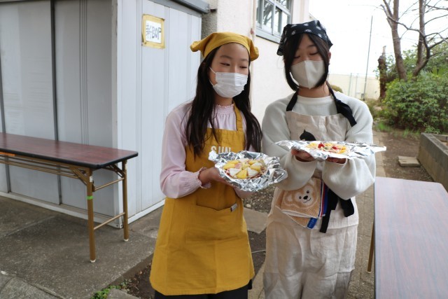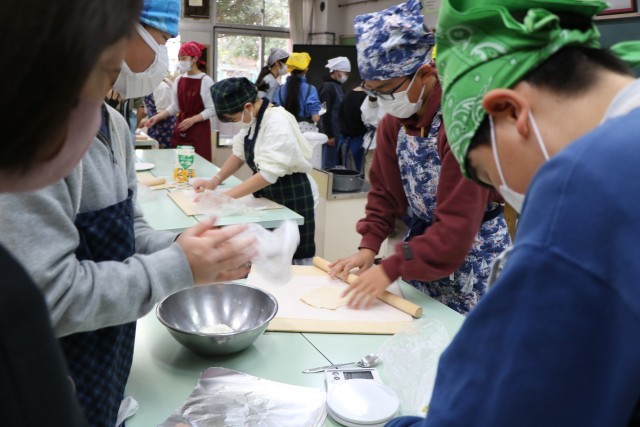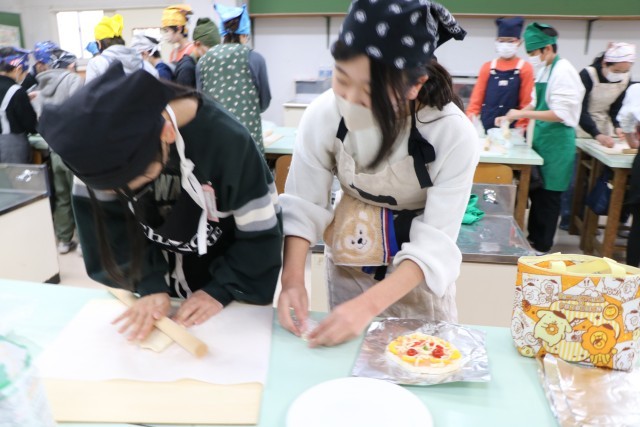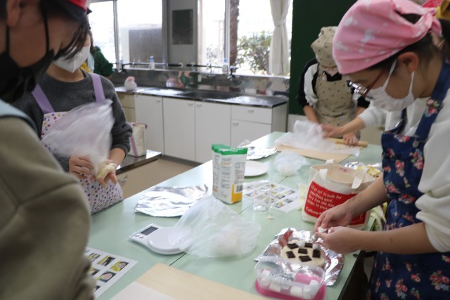 記事を一人ひとりこねて作ったらトッピングです。具材はそれぞれ家庭から持ってきました。チョコ・マシュマロ、照り焼きチキン、チーズたっぷり・・・色々あって楽しそうです。