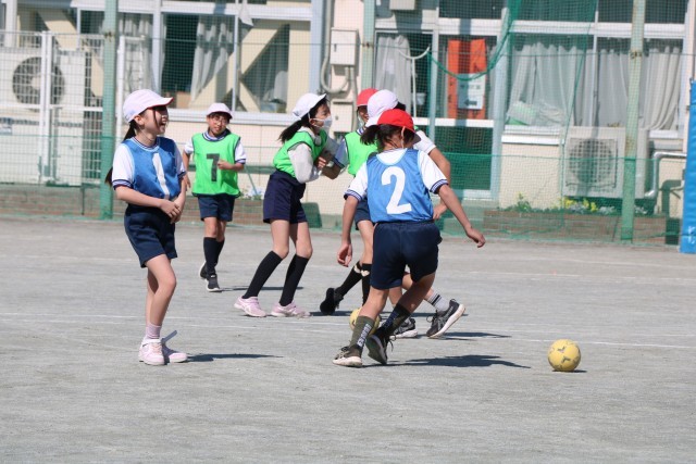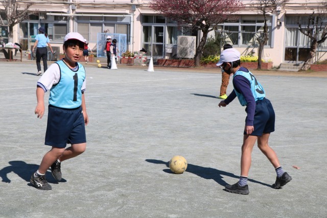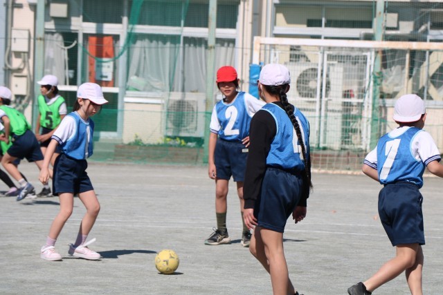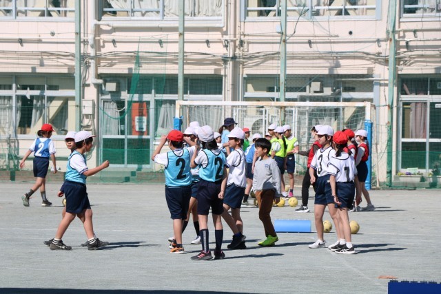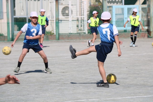 5年生体育「ボール蹴りゲーム」の学習の様子です。チームごとに繰り返し練習をし、いよいよ試合に臨みます。