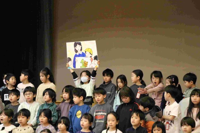 1年生の入学式練習の様子です。砧小の1年間を教えてくれる声がとても大きいです。
