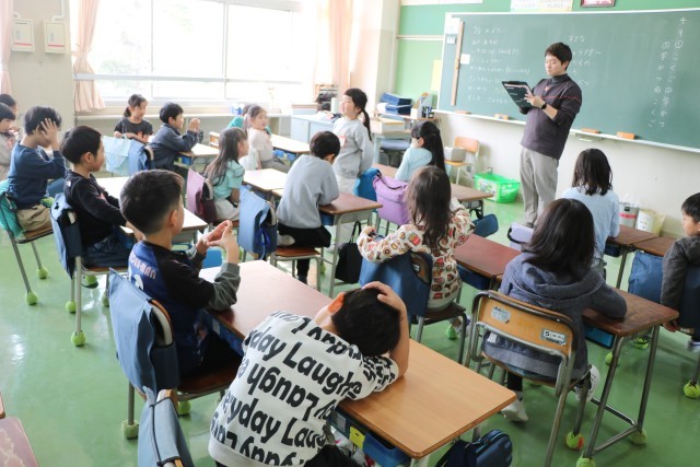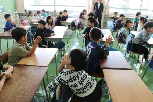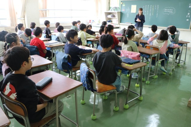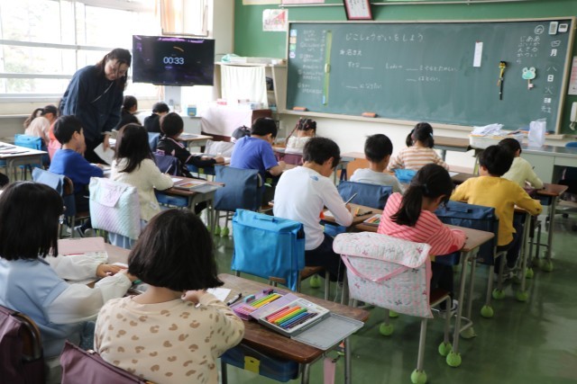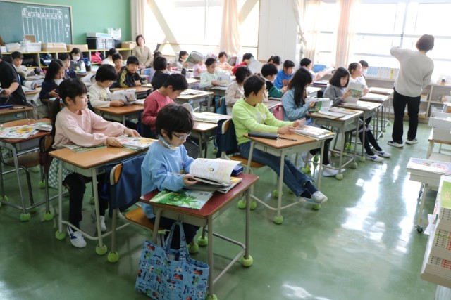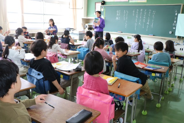 写真は2年生3年生の様子です。自己紹介をしたり、名前カードを書いたり、新しい教科書を確認したりしています。
