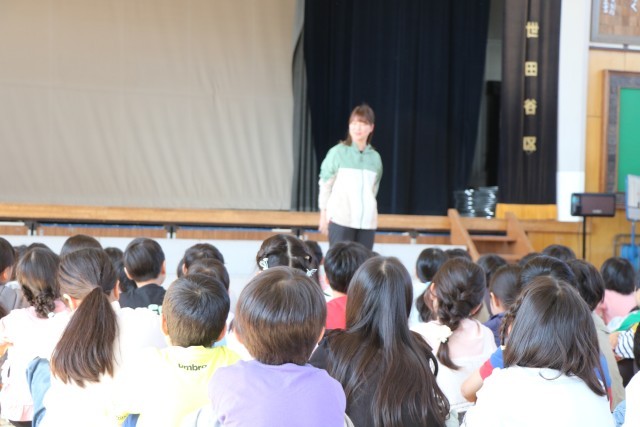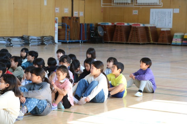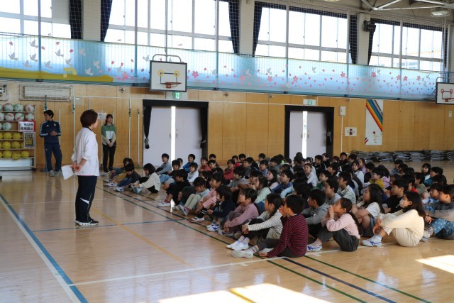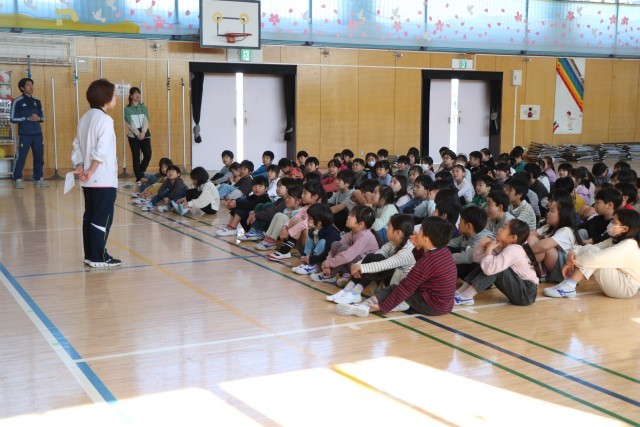 3年生は体育館で学年集会を開きました。3人の担任の先生の自己紹介、好きなこと、得意なこと、3年生の子どもたちの第一印象など、こといろいろ教えていただきました。そして学年の年間めあての発表です。