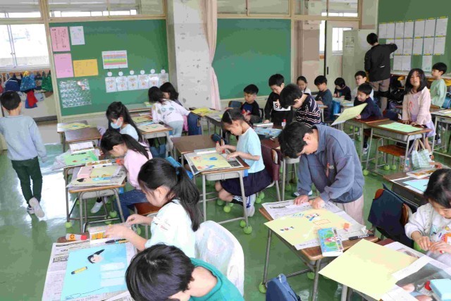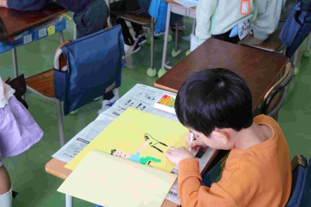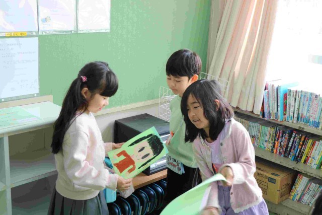 しかし、図工だからと言って絵を描いて終わりでなく、書き終えた子から「私は○○です。すきなことは△△です。この絵は□□しているところです。」と話しながら絵を見せ合う活動をしました。新しいクラスで新しい友達を作るのにぴったりでした。