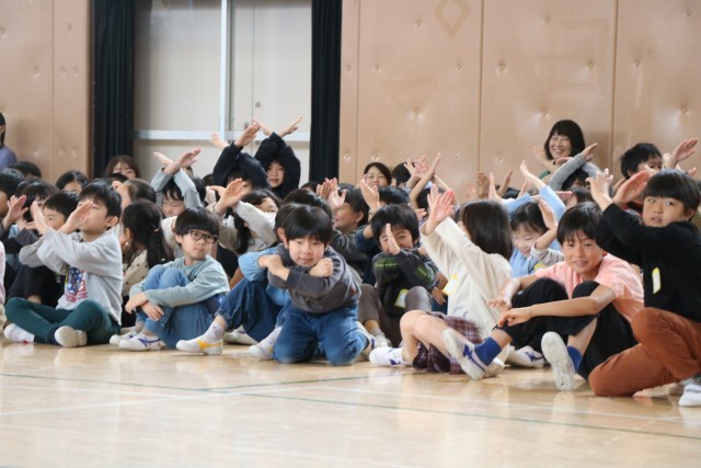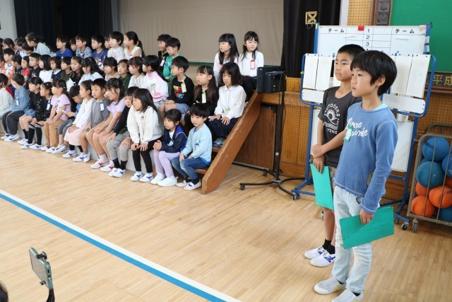 〇✖クイズでみんなで楽しみました。問題を出すと、正解を学年ごとみんなが教えてくれます。