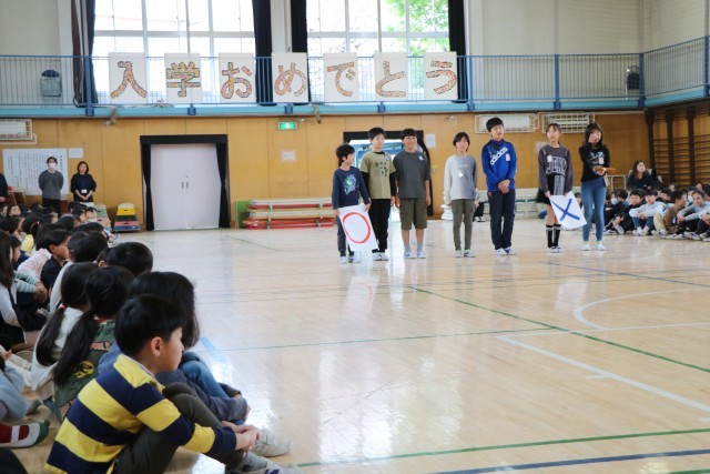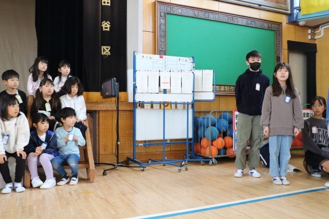 1年生が舞台正面のひな壇に座ったら会の始まりです。マイクなしでも司会の通る声が立派です。その声を聞こうと会場みんなが静かになる、全員でそういう雰囲気を作ろうとする姿勢が砧っ子の素晴らしいところです。