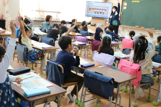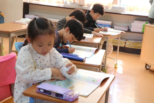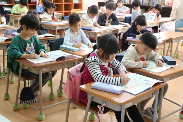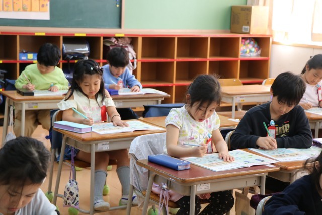 1年生算数の様子です。教科書の絵を見ながら楽器とくまさんの数の違い、一輪車とたぬきさんはどちらが多いか?一つひとつ線で結んだり、丸に置き換えたりしながら数の概念を数字にしていく学習です。みんな一生懸命取り組んでいます。