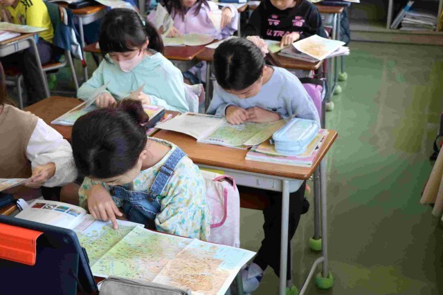 先生が言った地名をすばやく見つけて指さす活動では、「砧公園」「芦花公園」なども出てきました。自分たちに馴染みのある地名も地図に載っていると知り、見る目がさらに輝いていきました。